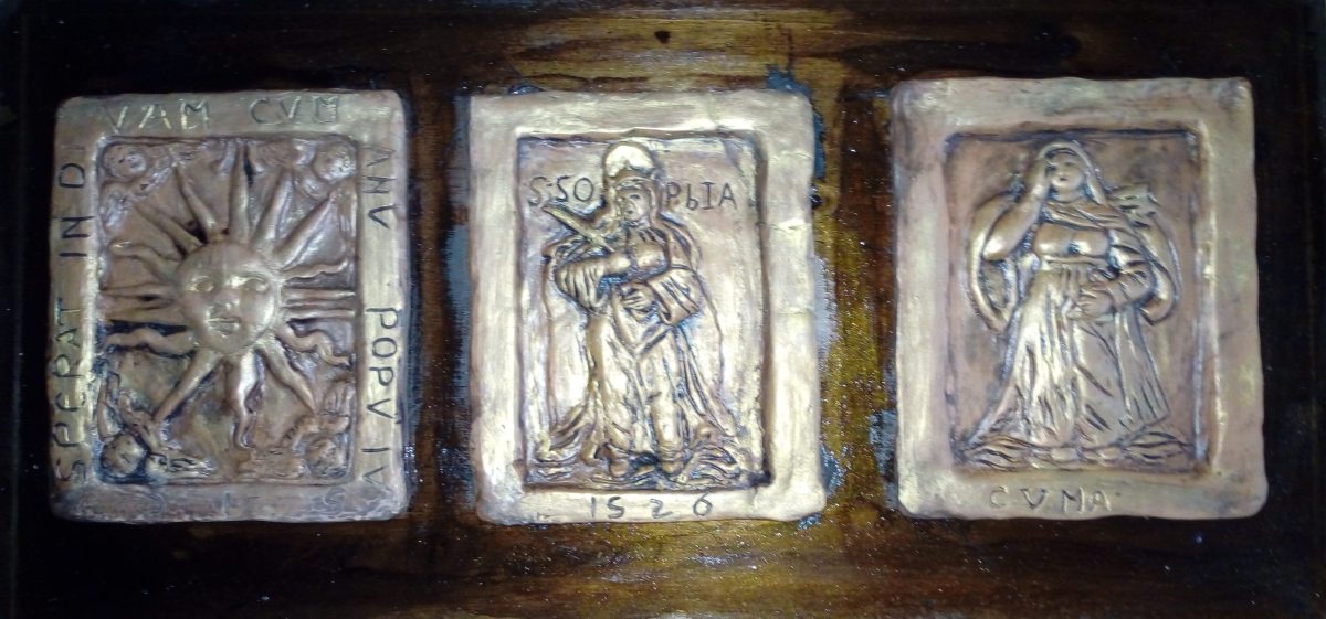 La realizzazione è stata resa possibile grazie ai calchi originali donati all’Associazione dal Maestro Costantino Scotti, scultore e pittore napoletano di grande rilievo, giuglianese d’adozione dal 2005 fino alla sua scomparsa nel 2008. Scotti aveva creato questi calchi come studio preparatorio per i tre bassorilievi in bronzo, successivamente donati al Comune di Giugliano e oggi collocati nell’androne della Casa Comunale. Le opere in bronzo riproducono fedelmente, in grandezza originale, i bassorilievi marmorei sottratti anni fa dal fianco della chiesa di Santa Sofia.